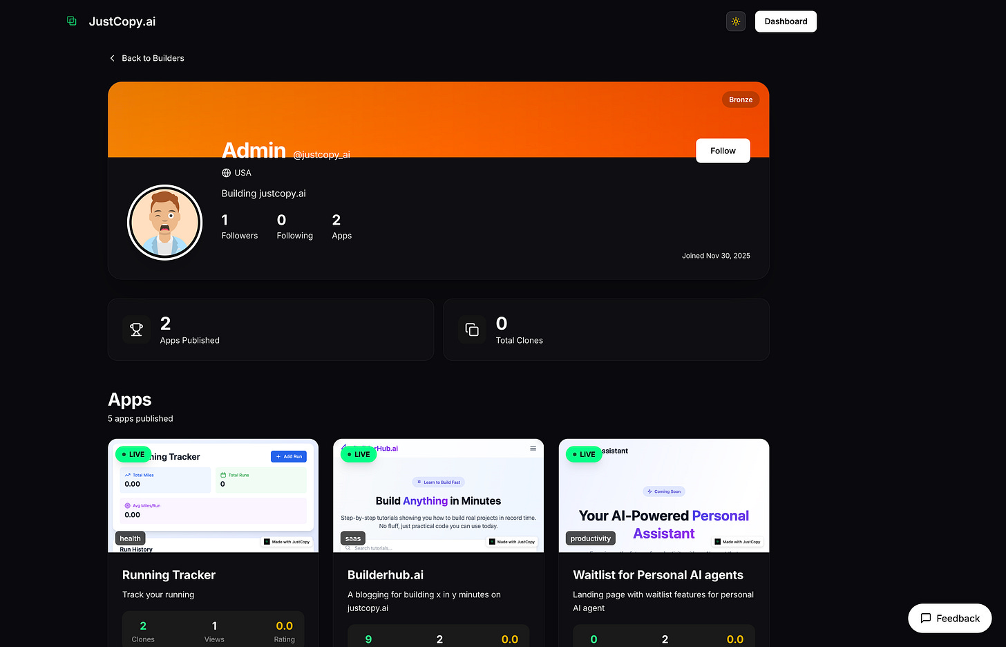 Simply publish your first app on JustCopy and your Builder Profile is automatically created with a clean, professional template.